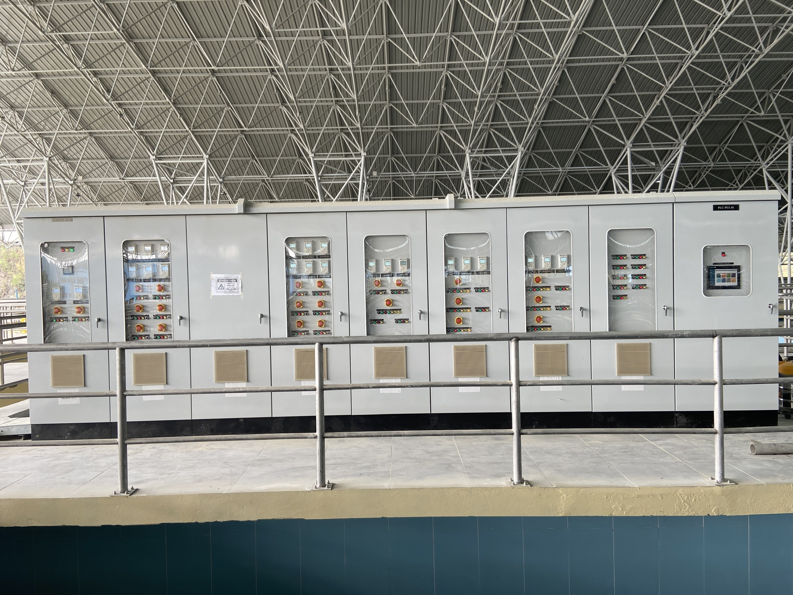 -Hệ thống tủ điện điều khiển, bàn điều khiển: Là hệ thống tủ điện chứa các thiết bị đo lường, bảo vệ, các thiết bị thực hiện chức năng điều khiển logic như đèn báo, nút nhấn, relay,.. để điều khiển hệ thống tải (bơm, quạt, máy nén khí,..)